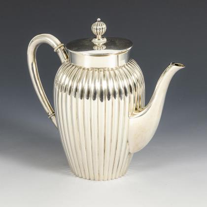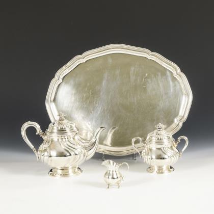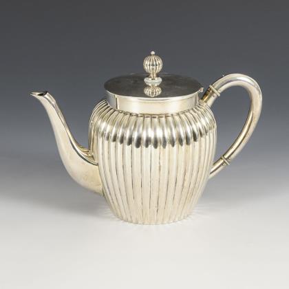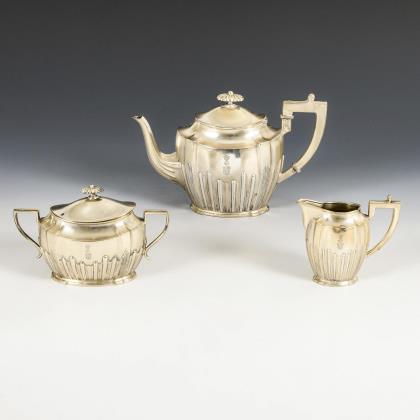 Ovale, teilgerippte Form mit gewinkelten Henkeln und schauseitigem Wappen mit Löwe, Helm und Pfauenfedern. Teekanne (H 16,5 cm), Zuckerdose (H 11 cm) und Sahnekännchen (H 10,5 cm)