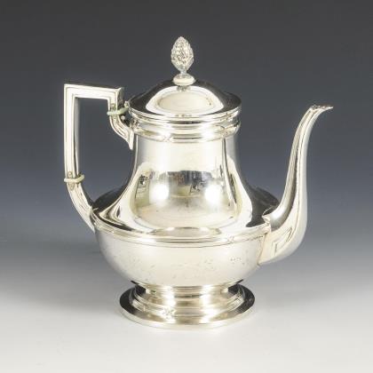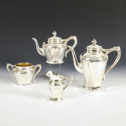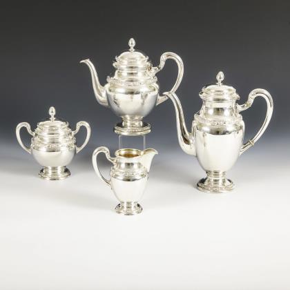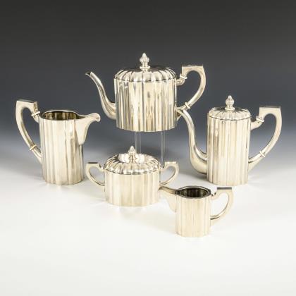 Bauchige Form, mit Relieffriesen verziert. Kaffeekanne (H 25,5 cm), Teekanne (H 22 cm), Zuckerdose (H 16 cm) und Milchkännchen (H 13,5 cm)