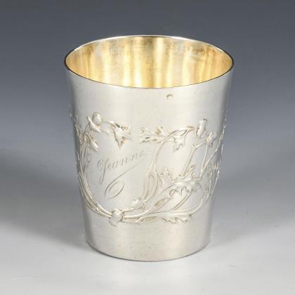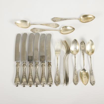 Für 6 Personen. Mit zeittypisch geschwungenem Blütenrelief. Je 6 Speisegabeln, Speisemesser und Suppenlöffel. Einige Teile mit verschlungener Monogrammgravur, 2 Löffel mit datierter Widmungsgravur: "Geb. 24. 2. 1910, Taufpate C.B.". In ergänztem, schwarzen Besteckkasten (9,5 x 29,5 x 23 cm)