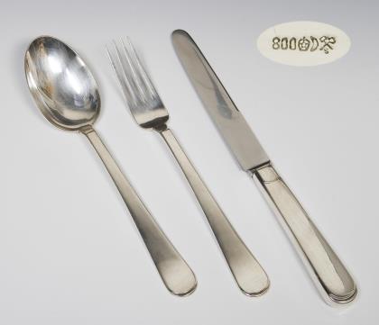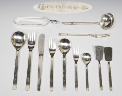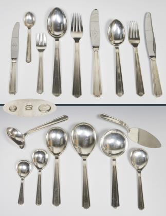 Beidseits reliefiert, Modell "Derby 1". 87 Teile: 6 Messer, 6 Gabeln, 6 Esslöffel, 10 Menü-Messer, 10 Menü-Gabeln, 18 Menü-Esslöffel, 18 Kuchengabeln, 5 Obstmesser, 6 verschiedene Servier-Löffel, 1 Soßenkelle, 1 Heber. Messer mit rostfreien Stahlklingen von Raadvard. Punzen: Stadtmarke mit Jahreszahl, teils Wardein von Johannes Siggard, Herstellermarken