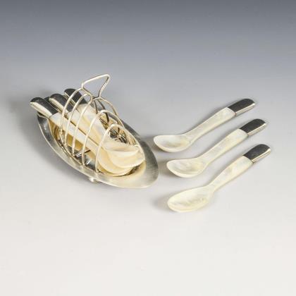Silberner Toastständer und 6 Eierlöffel aus Perlmutt.
