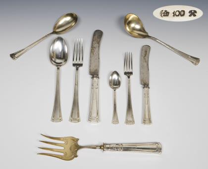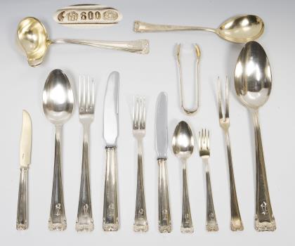 Modell "Annecy", Modell-Jahr: 1930. 121 Teile: 12 Messer, 16 Gabeln, 18 Esslöffel, 12 Menü-Messer, 12 Menü-Gabeln, 12 Menü-Löffel, 12 Fischmesser, 12 Fischgabeln, 6 Kaffeelöffel, 9 Menü-Messer mit Silber-Klingen. Design-Klassiker, massive qualitätvolle Arbeit, Messer mit originalen rostfreien Stahlklingen. Rückseitig graviertes Monogramm. Punzen: Feingehalt, Werkstattmarke