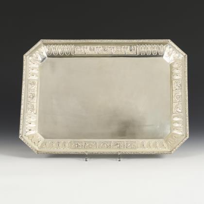 Großes rechteckiges Tablett mit abgeschrägten Ecken und umlaufendem Blatt- und Figurenfries