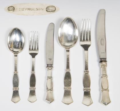 65 Teile: 12 Messer, 12 Gabeln, 12 Esslöffel, 6 Menü-Messer, 11 Menü-Gabeln, 12 Menü-Esslöffel. Messer mit rostfreien Stahlklingen von Macero-Solingen und von Raadvard. Punzen: Stadtmarke mit Jahreszahl, Wardein von C. F. Heise und Johannes Siggard, teils Marken von Eiler & Marloe oder Schriftzug C. G. Paulsen oder Monogramme CGP, ein Teil von 1937