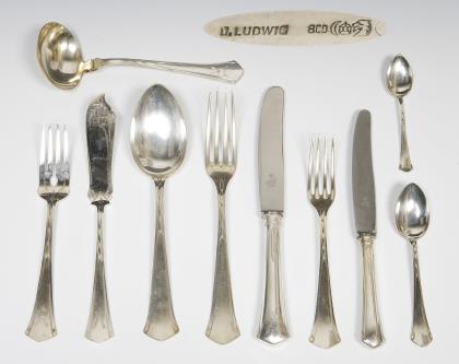 Weitere Hersteller: 11 x C. B. Schröder, Düsseldorf, 1 x Ludwig Ziech, Hamburg, 2 x A. Buse & Söhne, Zwickau. Modell von Joseph Maria Olbrich, Modell-Jahr: 1901. Besteck-Muster-Nr. 2000. 48 Teile: 5 Messer, 6 Gabeln, 6 Esslöffel, 6 Fischgabeln, 6 Fischmesser, 6 Eislöffel, 2 Eisvorleger, 6 Mokkalöffel, 2-teiliges Salatbesteck, 1 Servier-Löffel, 1 Buttermesser, 1 Käsemesser. Konische profilierte Griffe mit ligiertem Künstler-Monogramm JO im Rechteck, Original-Stahlklingen. Partiell gravierte Monogramme: 3 x rückseitig GM, 12 x frontal A, 7 x frontal W. Punzen: Fabrikmarken, Feingehalt-Auflage. 17 Teile ohne Punzen