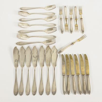 26 Teile mit stilisiertem Maiglöckchen-Dekor. 7 Fischgabeln und 7 Fischmesser (L 17/20,5 cm). 6 Obstgabeln und 6 Obstmesserchen (L 15/16,5 cm)