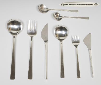 Modell von Carl Pott 1952, das sogenannte "Kanzlerbesteck". Besteck-Muster-Nr. 84. 58 Teile: 12 Messer, 6 Gabeln, 6 Esslöffel, 6 Menü-Gabeln, 6 Menü-Löffel, 6 Kuchengabeln, 6 Kaffeelöffel, 1 Servier-Gabel, 1 Soßenkelle, 2 Pastetenheber, 6 Schneckenzangen. Design-Klassiker, massive qualitätvolle Arbeit, gravierte Monogramme GK, Messer mit rostfreien Stahlklingen. Neben dem Kanzleramt von Ludwig Erhard wurden fast alle deutschen Botschaften mit dem Besteck ausgestattet. Punzen: Halbmond und Krone, Feingehalt, Fabrikmarke