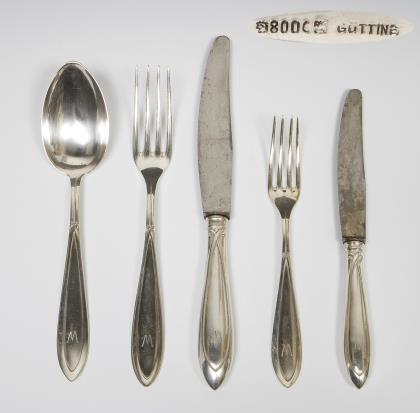 Entwurf Albert Mayer, Entwurfsatelier WMF. Für 12 Personen, mit Monogrammgravur "W": 12 Speisegabeln, 12 Frühstücksgabeln, 12 Fischgabeln, 12 Suppenlöffel, 12 Kaffeelöffel, 6 + 6 Speisemesser, 6 + 5 Frühstücksmesser, 12 Fischmesser und 1 Vorlegelöffel. In Kasten mit Karomuster