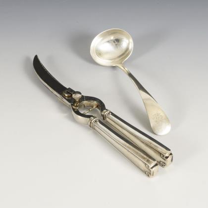 Salatbesteck und Silberkorb mit defektem Henkel.
