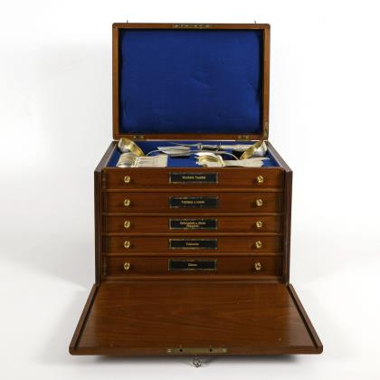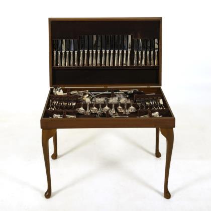 Mahagonifarbenes Tischchen im Chippendale-Stil, mit aufklappbarer Deckplatte und grüner Schreibfläche in Leder-Optik. Innen versilbertes Besteck für 12 Personen. Ca. 141 Teile. 12 Menügabeln, 12 Menümesser, 12 Frühstücksgabeln, 12 Frühstücksmesser, 12 Fischgabeln, 12 Fischmesser, 12 Suppenlöffel, 12 Löffel mit runder Laffe, 12 Kaffeelöffel, 12 Kuchengabeln, 6 Vorlegelöffel und 15 verschiedene Vorlegeteile