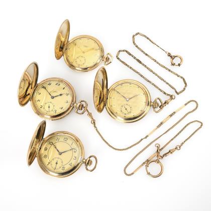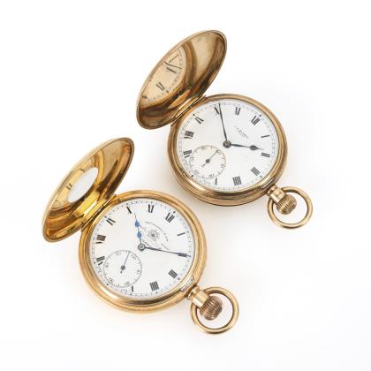 Vergoldete Halbsavonnette "Tho[ma]s Russell & Son, Liverpool, Tempus Fugit": Firmenmarke A.L.D., Gehäuse-Nr. 216530, Werk-Nr. 15169, gemarktes Werk mit Ankerhemmung, Steinen, Kronenaufzug, läuft nicht, Ø 5 cm, 114 g. | Goldene Savonnette "J.W. Benson, London": 375/Stadtmarke Birmingham/Firmenmarke A.L.D./Jahresbuchstabe D (1928) gepunzt, Gehäuse-Nr. 413273, gemarktes Werk mit Ankerhemmung, Feinreglage, geschraubten Chatons, Steinen und Kronenaufzug, im Kurzzeittest funktionstüchtig, Ø 4,9 cm, 95 g. Jeweils glattes Gehäuse und weißes Emailziffernblatt mit römischen Zahlen, Minutenkranz, kleiner Sekunde und gebläuten Spade-Zeigern