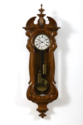 3-seitig verglastes Gehäuse mit gesprengtem Giebel und Zapfenkrone, geschweift geschnittener Front und Konsolabschluss