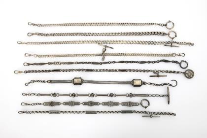 12 Teile. 5 Châtelaines teils mit Silbermünzen, 2 Charivari mit Zähnen, Hörnern und Krallen, 3 Tieranhänger für Charivari, 1 Erbskette mit Reiter, 1 Kette mit gepunzter Silbertafel