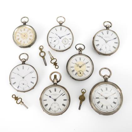Lépine-Gehäuse, 5x mit Münzrand und guillochierten Rückdeckeln mit leeren Wappenreserven und einer Krone, 2x mit floralen Gravuren, darunter auch eine Landschaft
