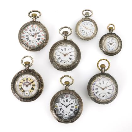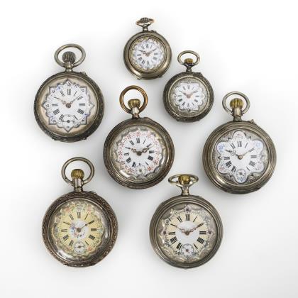 Lépine-Gehäuse mit floral und ornamental reliefierten Gehäusen, frontseitig überwiegend geschweift geschnittener Zierrahmen, rückseitig floral gravierte Deckel, teils mit leerer Wappenreserve, 1x mit Pferdemotiv