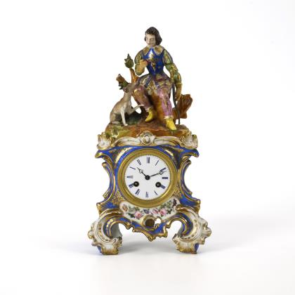 2-teilig. Rocaillierter Uhrensockel und Figurenaufsatz mit Jägersmann, mit blauem Fond, Blumen- und Goldmalerei