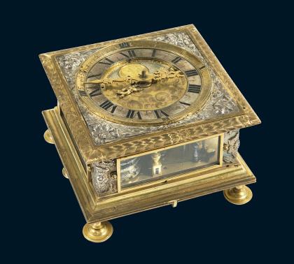 Platine signiert. Quadratischer Korpus mit floral getriebenen Ornamenten und aufklappbarer Unterseite auf Balusterfüßen, umlaufend aufgeschraubte Sichtfenster. Ziffernring mit geschwärzten römischen Zahlen für die Stunden, äußerer Ziffernring mit arabischer Minuterie, durchbrochen gearbeitete Zeiger, im Zentrum Wolkensymbole und gravierte Mondscheibe vor gouillochiertem Himmel. Aufwendig gearbeitete Platine mit floral durchbrochen gearbeiteten Applikationen, einige Teile in gebläutem Stahl. Spindelwerk mit Kette und Schnecke, Viertelstunden-Schlagwerk auf zwei Glocken im Boden, drei Aufzüge