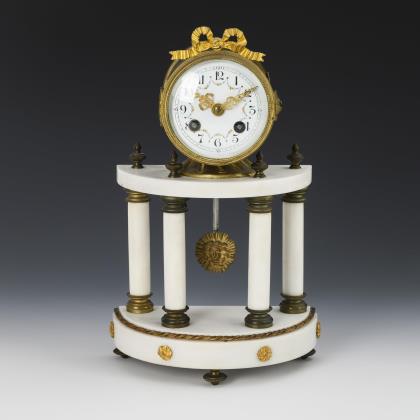 Portaluhr mit 2 Prunksäulen, bekrönende Uhrentrommel mit Floralranken