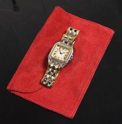 Mittleres Modell, Quarz-Werk. Champagnerfarbenes Zifferblatt, Datum-Fenster auf der 5-Uhr-Position, schwarze römische Zahlen, große Sekunde, gebläute Stahlzeiger. Facettierte Aufzugskrone mit saphirblauem Cabochon, flexibles fünfgliedriges Armband mit Doppel-Faltschließe. Original-Täschchen "Cartier International Service" aus rotem Wildleder
