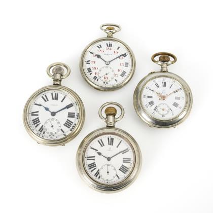 Glatte, teils gravierte Metallgehäuse, 2x mit Eisenbahn-Motiv und ligiertem Monogramm, 1x mit hohem, facettiertem Zifferglas. Omega mit Schraubdeckel