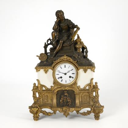Figurenpendule im Barock-Stil mit hohem, prunkvollem Reliefsockel und bekrönendem Naturstück mit einem sinnierenden Maler