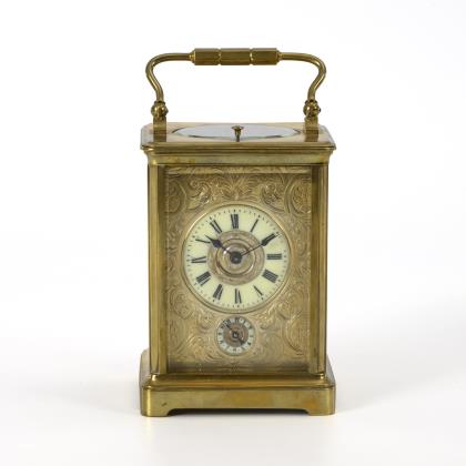 Lépine-Gehäuse mit teils floral und ornamental reliefierten Gehäusen, frontseitig geschweift geschnittener Zierrahmen, rückseitig floral gravierte Deckel mit leerer Wappenreserve