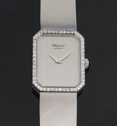 Handaufzug. Lünette mit 54 Brillanten, Krone mit saphirblauem Cabochon, Milanaise-Band, Faltschließe mit Chopard-Emblem C und kleinem Diamant, neutrales Etui