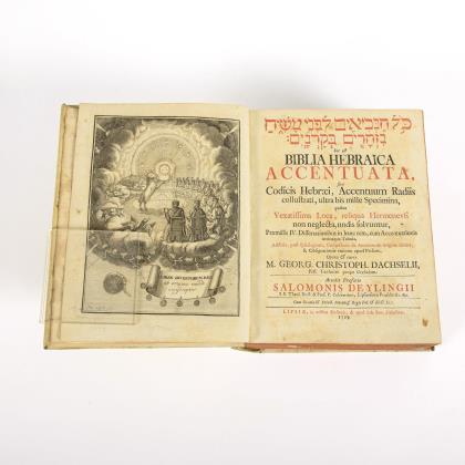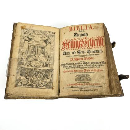 Verfasser: Vitum Dieterich, Mitverfasser: Philipp Melanchthon und Johannes Brenz d.Ä. Titelholzschnitt, monogrammiert "GW". (23), 305, (11), Neues Testament Titelblatt, 344, (4) Seiten. Geprägter Pergamenteinband mit intakten Schließen. Seite 187 und hinterer Vorsatz mit Wasserzeichen im Papier