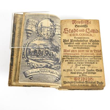 Titelkupfer mit einer Stadtansicht von Gera. (22), 284, 172, (24) Seiten, im Halbpergamenteinband. Vorsatz mit handschriftlichen Notizen