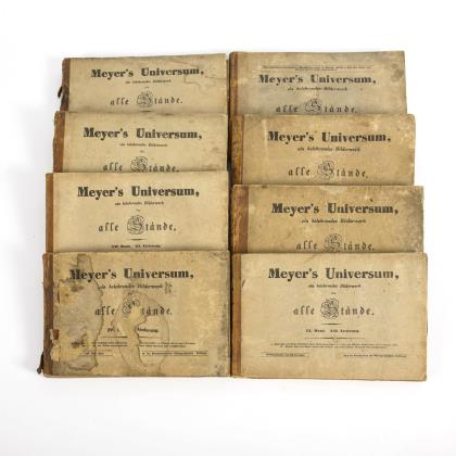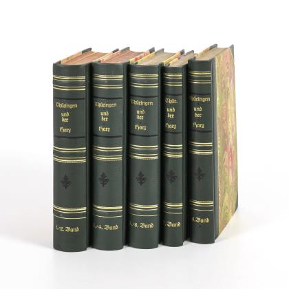 8 Bände in 5 Büchern, jünger in goldgeprägtes Halbleder nachgebunden. Mit zahlreichen Stahlstichen, pro Band meist 12 Stück. Bände kollationiert, es fehlen im Band 2 Blankenburg und Wartburg