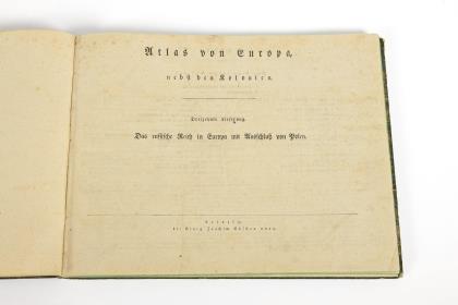 Titelblatt, 29 Textseiten, 25 Tafeln mit Grenzkolorierungen. Inklusive der seltenen Karte "Das Russische Amerika". Im Pappeinband der Zeit mit Goldprägung und Grünschnitt