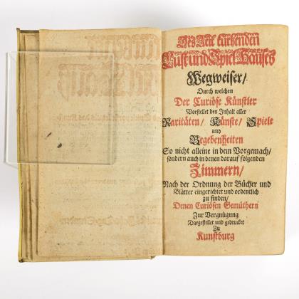Doppelseitiger Titelkupfer, doppelseitiger Titel, Titel, (30), 150, Werbeblatt, 1371, (1) Seiten. Über Schachspiel, Kartenspiele, Taschentricks, Rätsel, Wahrsagen und vieles andere mehr. Teils mit Illustrationen, im zeitgenössischen Pergamenteinband