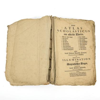 Weltkugel / Aegyptus Hodierna / Cataloniae / Aquitaniae / Ducatus Britanniae - de Bretagne / Magna Britannia / Regnum Anglia / Regnium Scottiae / Belgio ... Catholicae / Ducatus Luxemburgi / Comitatus Flandriae / Ducatus Brabantiae / Belgii ... Hollandia / Helvetiorum / Italiae / Imperium Romano-Germanicum / Archiducatus Austriae / Ducatus Carnioliae ... et Histriae (Krain) / Tirolis / Circulus Franconicus (Seutter) / Bavariae / Circuli Sveviae (Schwaben) / Rhenanus Inferior / DerRhein, die Maas und Mosel / Circuli Westphaliae / Rheni Superioris Mosae et Mosellae(Dancker) / Rheni Inferioris Mosae et Mosellae (Dancker) / Saxoniae Inferioris Circulus (Seutter)/ Circulus Saxoniae Inferioris / Ducatus Mecklenburgici (Seutter) / Sachsen (als zweibogige, halbe Karte) / Ducatus Pomeraniae / Moravia (Seutter) / Regni Daniae / Iutiae - Jütland / Insulae Danicae / Scandinavia / Regni Poloniae / Turcicarum et Tartaricum (Seutter) / Danubii ... Graeciae / Imperii Moscovitici pars Septentrionalis (Seutter) / Imperiii Moscovitici pars Australis (Seutter) / Ukrania / Terra Sancta. Beinhaltet auch Titelblatt mit Inhaltsverzeichnis und einige Karten des "Kleiner Atlas Scholasticus" von Johann Baptist Homann. Von diesem fehlen aber wohl 5 Karten