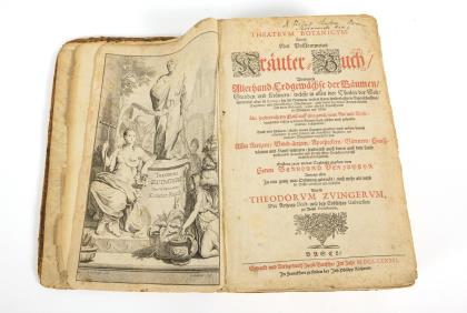 Titelblatt, (15), 343 Seiten in deutscher Sprache mit einigen Holzschnitten von Pflanzen und einer Apothekereinrichtung, in einem jüngeren Ledereinband mit fehlenden Schließen. Als Kapitelüberschrift im Block auch genannt "Teutschen Apotecken"