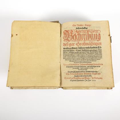 Kellner, Johann: "Ein Neuwe, Kurtze, doch warhafftige Beschreibung deß gar Großmaechtigen weitbegriffenen, bißhero vnbekandten Koenigreichs China ... in ... in Hoch-Teutsch gebracht", Gedruckt zu Franckfurt am Mayn, in Verlegung Sigmundt Feyerabends, 1589. Ursprünglicher Verfasser: González de Mendoza, Juan (1545-1618). Siehe auch: VD16 G 2654. Titel, (15), 181, (1) Seiten, unterteilt in drei Bücher. / Johann Vogel von Dreßden: "Bericht Von den alten Riesen und Hewnen, Auch was man noch heutiges Tages etwan ubriges von jnen finde ...", ursprünglicher Verfasser Jean Chassanion und Iohan.Cassione von Monstrohl. Gedruckt zu Görlitz durch Ambrosium Fritsch, 1588. Titel, (76) unnummerierte Seiten. Vergleiche auch VD16 C 2072. / Räteln zu Sagan, Heinrich: "Wunderbare, Erschreckliche, Vnerhoerte Geschichte, vnd warhaffte Historien: Nemlich, Des nechst gewesenen Großfürsten in der Moschkaw Joan Basilidis, (auff ire Sprach Iwan Basilowitz genandt) Leben". Gedruckt zu Görlitz, bey Ambrosio Fritsch, 1588. Titel, (232) unnummerierte Seiten. Diese frühe Ausgabe von 1588 ist nicht im VD16 verzeichnet. Nur VD16 O 262 und VD16 ZV 27295 jeweils von 1596 und anderer Drucker. Alles im geprägten, weißen Ledereinband mit defekten Schließen