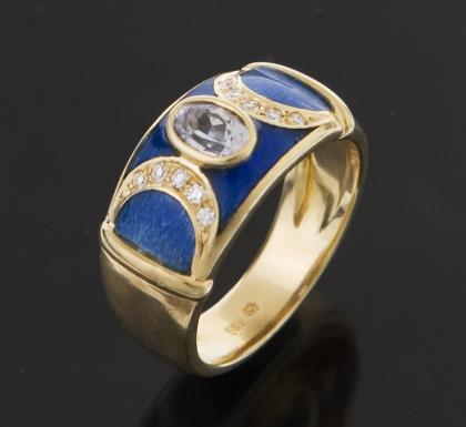 Breiter stabiler Bandring, partiell blau emailliert, mittig farbloser facettierter Saphir circa 0,7 ct, seitlich 10 kleine Diamanten. Punzen: Feingehalt, Juweliermarke
