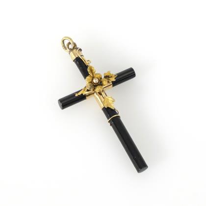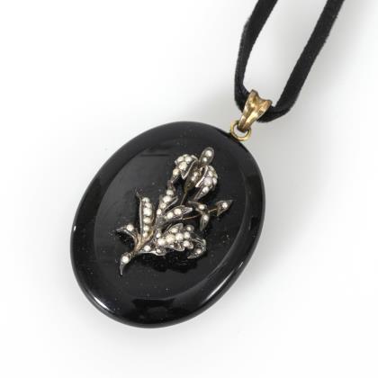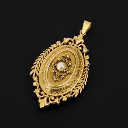 Um 1880, aufwändig gearbeitetes Medaillon mit aufgesetzter Perle, umrahmt von Fleur-de-Lys und Lorbeerkranz-Elementen