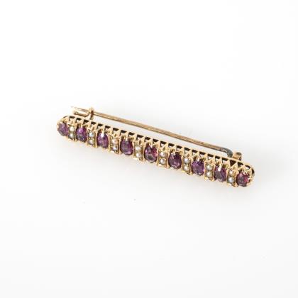 Stabbrosche, wohl aus der Zeit des späten 19. oder frühen 20. Jahrhunderts mit violetten Steinen im Navette-Schliff, wohl Amethyste, abwechselnd mit Paaren aus halben Saatperlen gefasst. Die Nadel mit einfachem Hakenverschluss