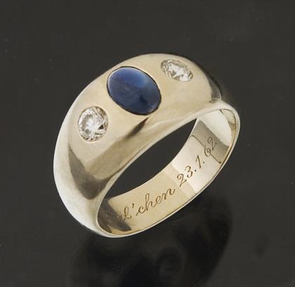 Ovaler Saphir-Cabochon circa 7,5 x 5 mm, 2 Diamanten je circa 0,25 ct, zusammen circa 0,5 ct. Massiv gearbeitet, stabile volle Schiene. Punzen: Feingehalt, gravierte Widmung: "Eul'chen 23.01.(19)62"