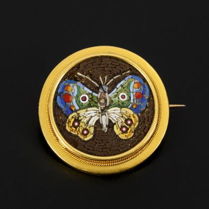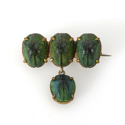 Brosche aus der Zeit um die Jahrhundertwende, entstanden wohl vor dem Hintergrund des damaligen Interesses für das Alte Ägypten. Bei dem vorliegenden Entwurf sollen die verwendeten Schmuckkäfer wahrscheinlich an den Skarabäus als altägyptisches Götter- und Glückssymbol erinnern