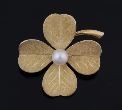Glücksklee-Brosche mit Perlchen. Theodor Wilhelm Herbstrieth, Pforzheim.