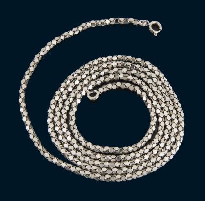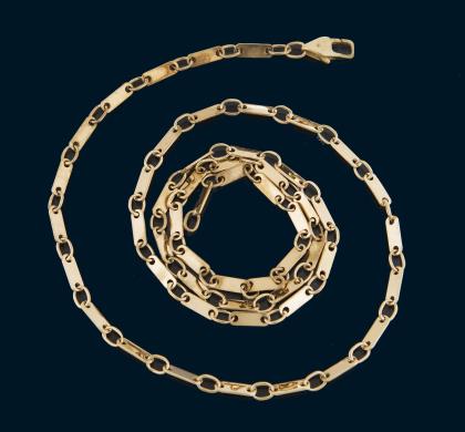 Stabförmige Glieder zwischen ovalen Ösen, Karabiner-Schließe. Punzen: Feingehalt