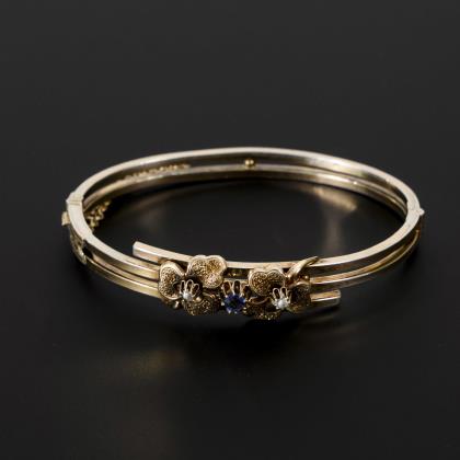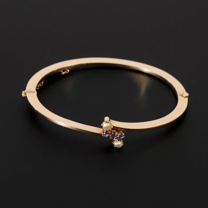 Historischer Armreif aus der Zeit um 1890 mit zwei, je mit halben Saatperlen besetzen Kleeblattornamenten, dazwischen ein chatongefasster blauer Farbstein, evtl. ein Saphir. Das Schloss mit detailreicher Rankenverzierung und zusätzlichem Sicherungskettchen
