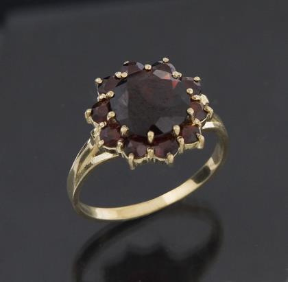 1 runder facettierter Granat ø 9 mm, 10 kleine Granate in Krappenfassungen, schmale stabile Schiene, Punzen: Feingehalt