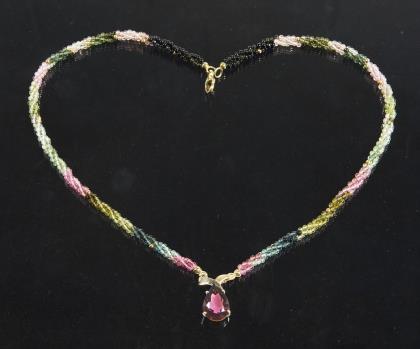 Violetter facettierter Turmalin in Krappenfassung, Multicolor Kordelkette mit kleinen Schmuckstein-Rondellen, Karabiner-Schließe, Punzen: Feingehalt