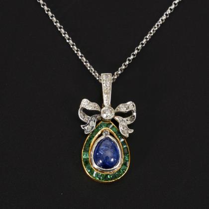 Außergewöhnlicher Anhänger mit einem Schleifenornament, besetzt mit einem Altschliff-Brillanten und kleinen Diamanten, darunter in Tropfenform ein Cabochon eines milchig-blauen Farbsteins, umgeben von kanalgefassten Carrés eines grünen Farbsteins
