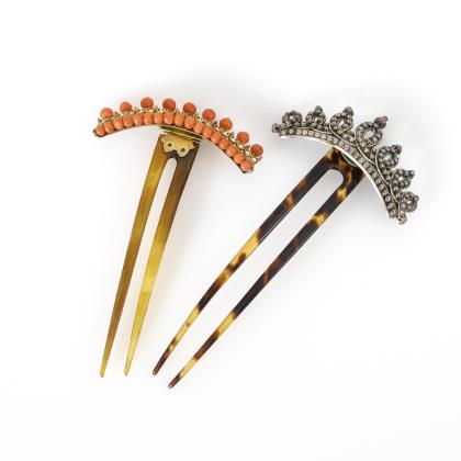 2. Hälfte 19. Jh. Ein Steckkamm mit kronenförmigem Ornament in Imitation der "cut steel"-Technik, der zweite mit Besatz aus kleinen Korallenperlen