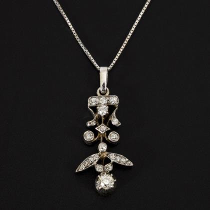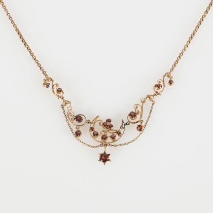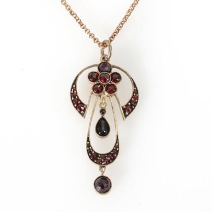 Anhänger wahrscheinlich aus der Zeit um die Jahrhundertwende in der Art der im späteren 19. Jahrhundert vorherrschenden Granatschmuck-Mode, allerdings in einem zeitaktuellen Jugendstil-Entwurf gearbeitet