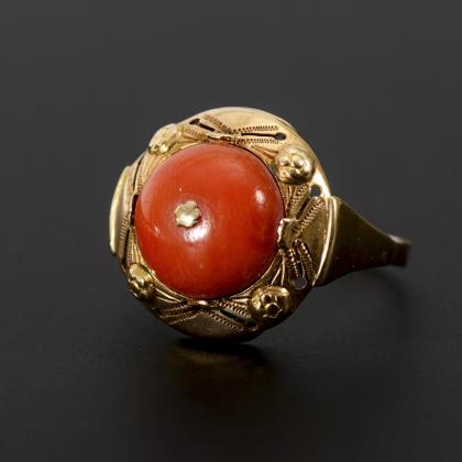 Ring der 2. Hälfte des 19. Jahrhunderts mit einem großen Korallen-Cabochon in einem ornamentierten Ringkopf an breiten Ringschultern