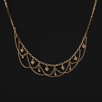 Zartes, roségoldfarbenes Jugendstil-Collier mit Ketten-Abhängungen sowie kleinen Kugeln und mit halbierten Saatperlen besetzten herzförmigen Anhängern